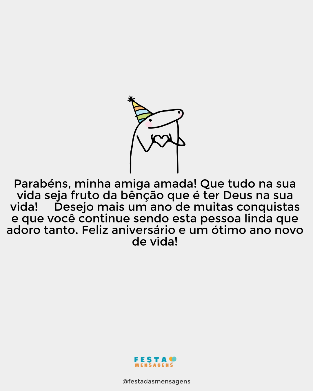 Diz o poeta: 'amigo é coisa para se guardar do lado esquerdo do peito', e você, minha amiga, não poderia ser diferente. Além de grande amiga, irmã na fé e em Jesus Cristo, é a mulher mais dotada na maior força do Espírito Santo, já conhecida por mim. É uma grande honra ser seu amigo! Nesta data de extrema alegria, gostaria de deixar consignado o meu abraço fraterno e parabéns pela data feliz do seu aniversário, junto à sua família e seus amigos que são muitos. Parabéns!