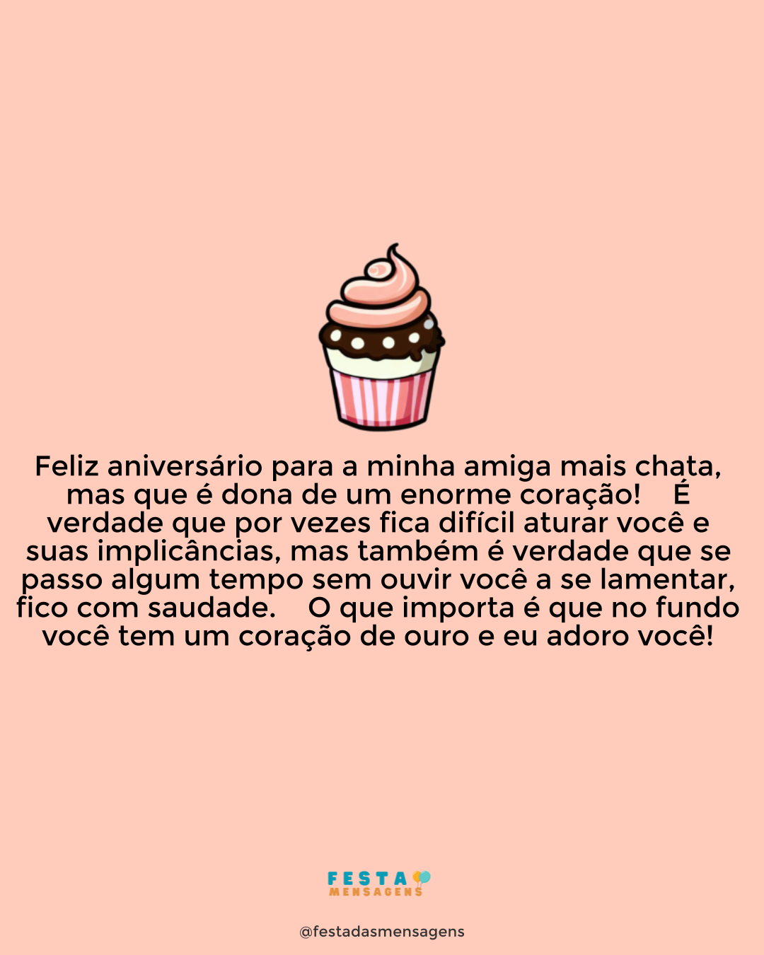 Não existe no mundo gargalhada mais linda e contagiante, loucura mais saudável e existência mais marcante que a sua, minha amiga mais doida. Feliz aniversário! A vida sem você, sem a sua reconfortante e exuberante alegria, seria a mais triste das realidades. Basta eu pensar em você para que meu rosto ganhe um sorriso e no coração sinta paz. Muitas felicidades, minha amiga, hoje e sempre! Amo muito você e nossa divertida amizade que eu desejo, se prolongue pela eternidade. Continue sorrindo, sonhando, dançando, cantando, amando... para sempre!