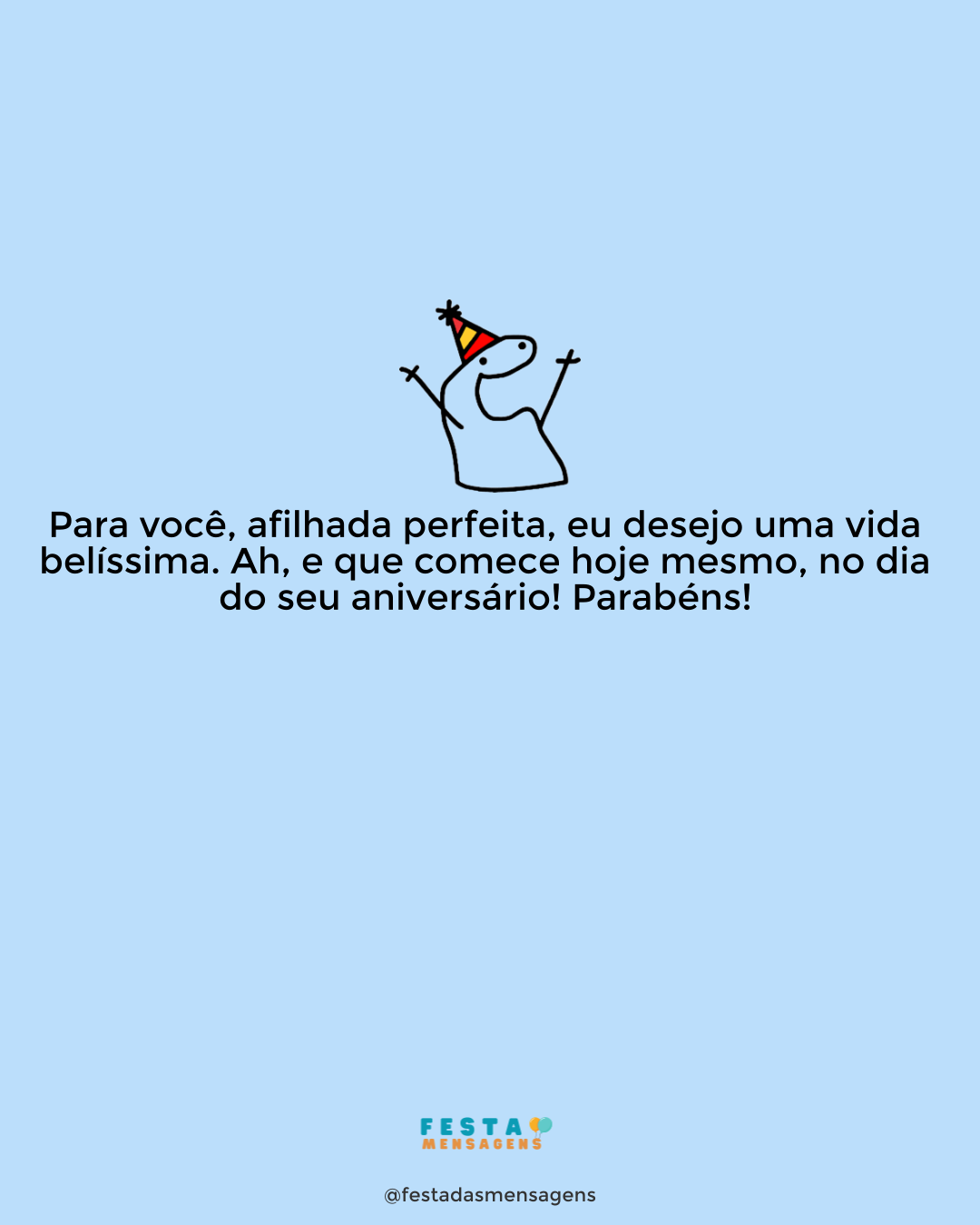Tudo que eu desejo hoje é que você se divirta como nunca e se sinta orgulhoso do seu percurso. Padrinho, tenha um aniversário maravilhoso, igual seu coração! Peço, por favor, que continue correndo atrás de todos seus sonhos, sem desistir, sem abrandar, sem medos. Você é um ser humano que merece tudo que existe de magnífico neste mundo, por isso, não pare até encontrar tudo aquilo que procura. Eu estarei ao seu lado, sempre. Feliz niver, padrinho!