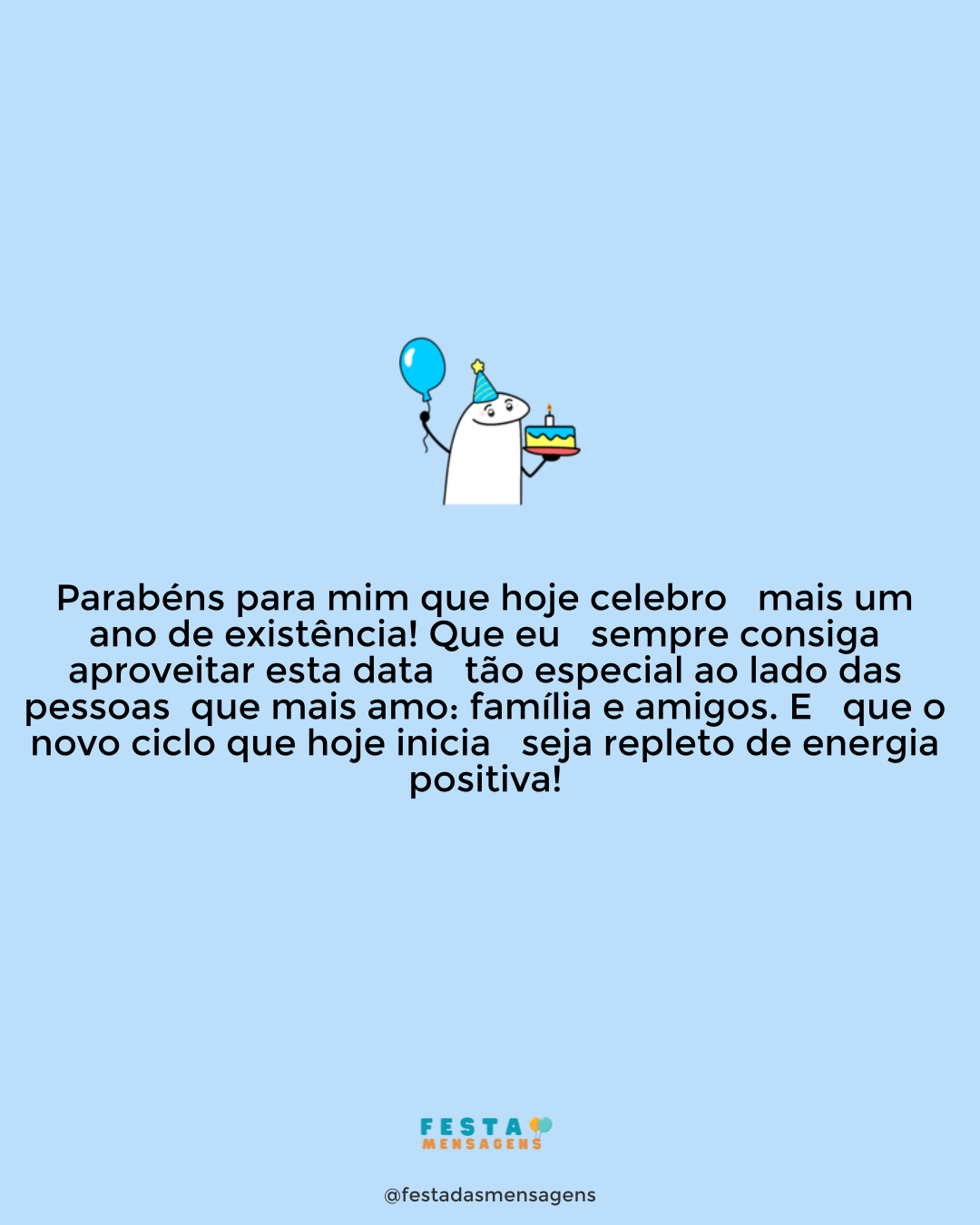 Pule, grite, dance e dê risada, faça o que lhe traz paz e alegria sem remorso ou melancolia, porque hoje o dia é seu e de mais ninguém. Feliz Aniversário!