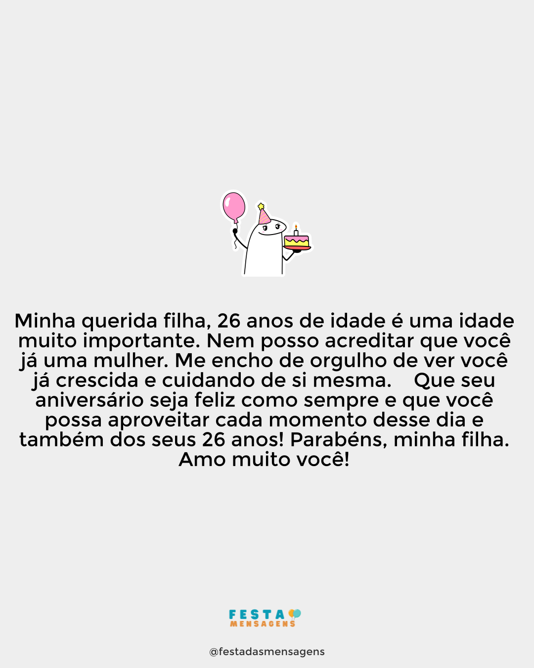 Filha, você sabe como eu a amo e como lhe desejo um dia feliz, hoje e sempre. Meu amor, parabéns por completar seus primeiros doze anos de vida. Tenha um aniversário lindo e maravilhoso igual nossa ligação! Você tem sido simplesmente a melhor companhia do mundo. Sempre que preciso de um sorriso você surge para o desenhar no meu rosto; quando preciso de aconchego é seu abraço que envolve meu corpo. Eu só posso agradecer a você e à vida pela chance feliz de ter uma filha assim tão generosa e delicada, tão honesta e bondosa. Minha querida, aproveite muito esta data e divirta-se, porque dar risada é sempre bom. Parabéns!