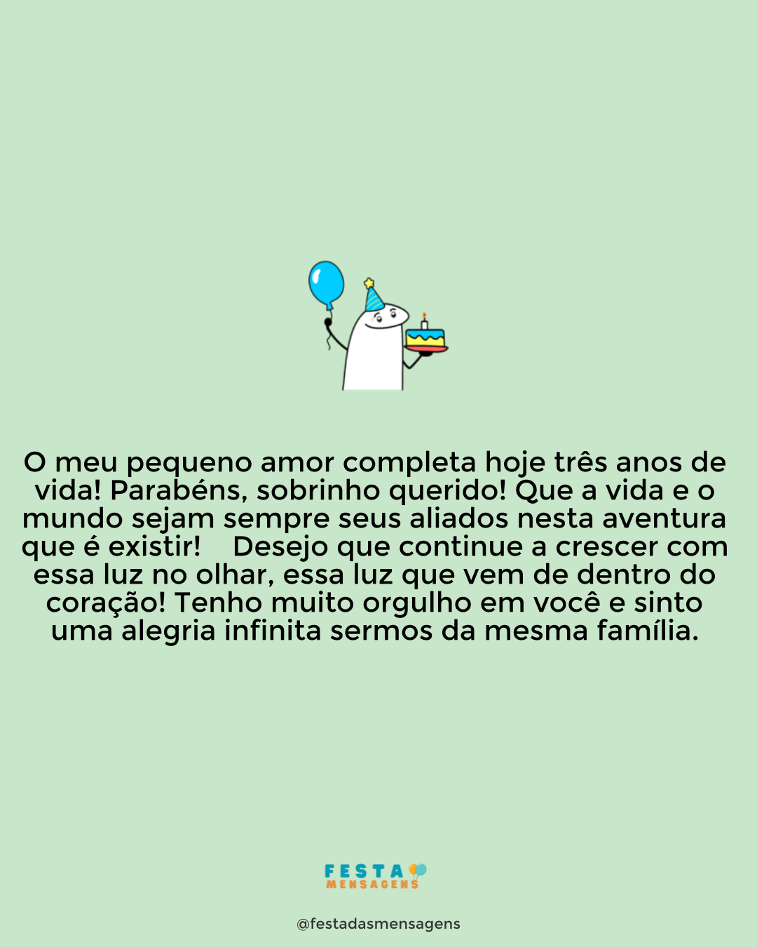 Meu bebê, meu sobrinho querido, bem sei que você não consegue ainda perceber tudo que tenho para lhe dizer, mas acredito que sente e isso é mais importante. Parabéns pelo seu aninho de vida! Continue se desafiando, evoluindo, crescendo e sempre se divertindo. Estarei sempre, mas mesmo sempre aqui para tudo que você precisar. Feliz aniversário!