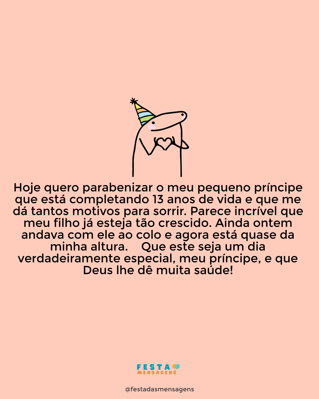 Por você eu sinto orgulho, mas também muita admiração, amor, paixão e todos os sentimentos bons da vida. Filho, celebre seu aniversário número doze com muita paz no coração. Eu amo você, meu querido. Parabéns! Continue sendo esse exemplo para todos seus amiguinhos e até familiares. Nunca deixe de ser quem é nem de fazer o que verdadeiramente quer. Corra atrás dos sonhos, mas encontre sempre tempo para relaxar e apreciar a vida. Amarei você para sempre, filho. Feliz aniversário!