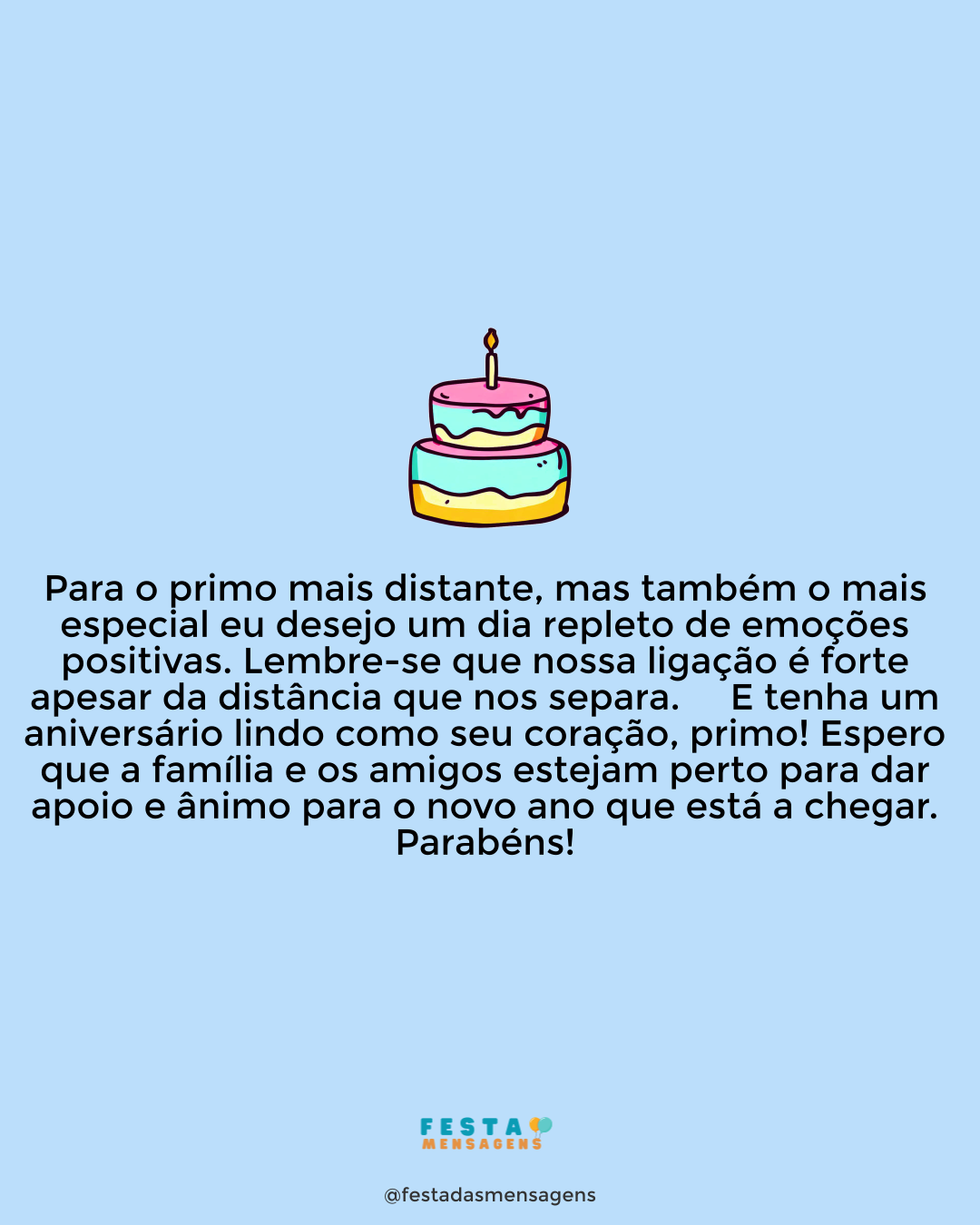 O dia será repleto de paz, amor e alegria para seu aniversário seja celebrado com toda harmonia. Felicitações! Junte todos os amigos e familiares e não se esqueça de sorrir, de pular e de dançar até ser dia novamente.