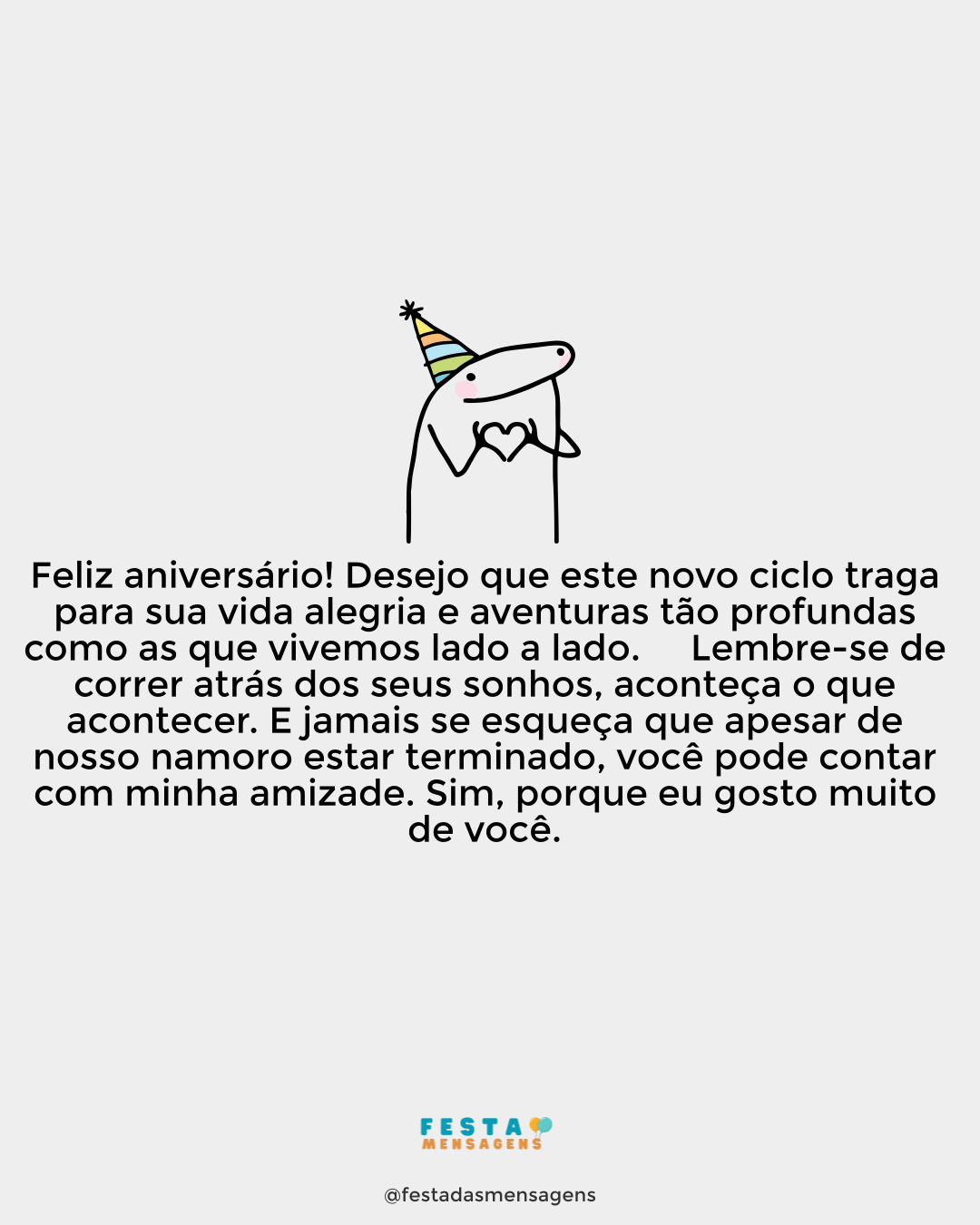 Mesmo não estando mais juntos nunca esqueceria um dia tão especial. Saiba que todo tempo que fomos namorados você me fez muito feliz, e é uma pena nossos destinos terem insistido em ir para lados opostos. Nunca deixe de ser essa pessoa alegre e de bem com vida, você merece tudo de melhor! Muita saúde, paz, sucesso, dinheiro e que consiga encontrar alguém que o possa fazer muito feliz assim como você me fez. Apesar de tudo sinto muita falta dos seus carinhos e espero que nunca deixemos de lado nossa amizade. Todo amor que um dia senti por você continua muito bem guardado, só que de uma forma diferente, mas não menos importante. Espero que tenha um dia formidável! Feliz Aniversário!