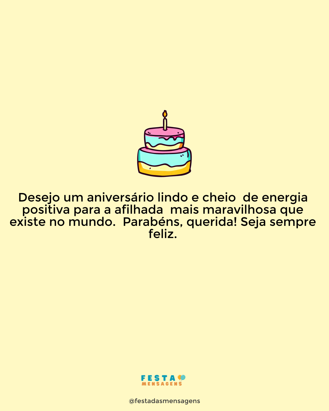 Não basta você ser uma sobrinha incrível como é ainda minha afilhada e quase filha! Eu adoro tudo no seu jeito. Nunca mude, querida! Parabéns por mais um ano de vida! Você sabe que meu amor por você não tem dimensão. É algo gigante, maior do que eu; maior do que o mundo. A minha existência só faz sentido porque você existe. Sobrinha e afilhada, seja sempre essa menina doce que por mais que envelheça nunca ganha ruga de tristeza ou amargura. Gosto de você daqui até ao céu. E lembre-se que onde eu estiver você estará com toda certeza no meu pensamento e coração. Espero e desejo que seu dia fique marcado pelo amor e amizade de quem você mais gosta. Feliz aniversário!