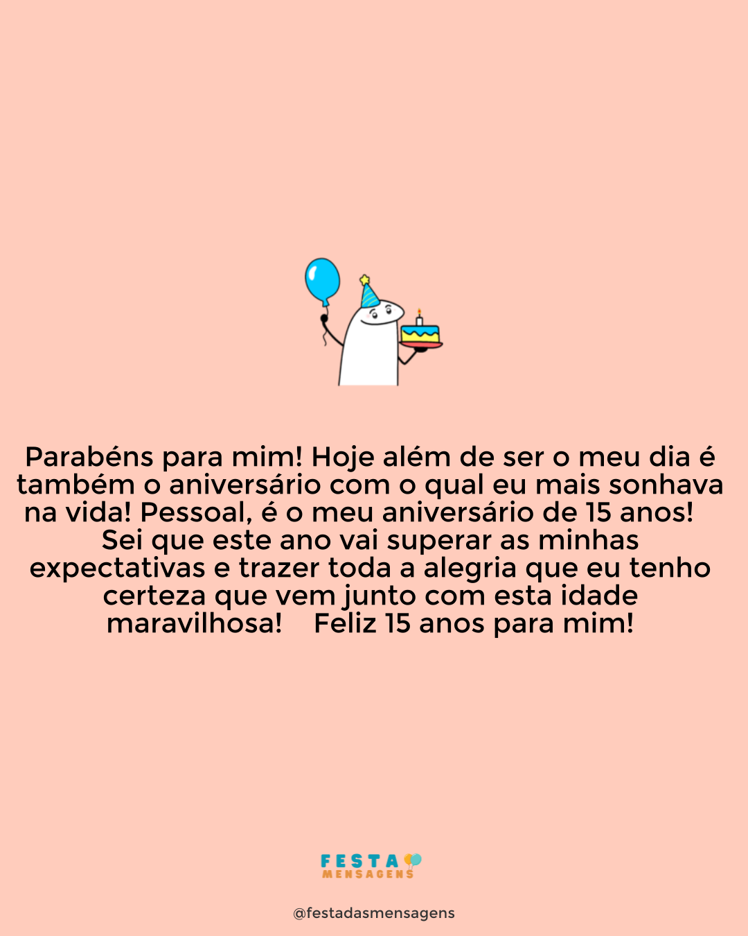 Estou de parabéns e isso me deixa tão feliz! Completo hoje quinze anos de vida; os primeiros de uma existência que espero longa e muito entusiasmante. Não vejo a hora de abrir meus presentes e descobrir em cada um deles um pouco do amor de quem os ofereceu. É isso que importa quando recebemos alguma coisa: que seja de valor. Quero também abraçar meus amigos e receber todo carinho da minha família! Sinto que sou hoje uma pessoa melhor, mais completa e preparada para tudo na vida. Parabéns para mim!