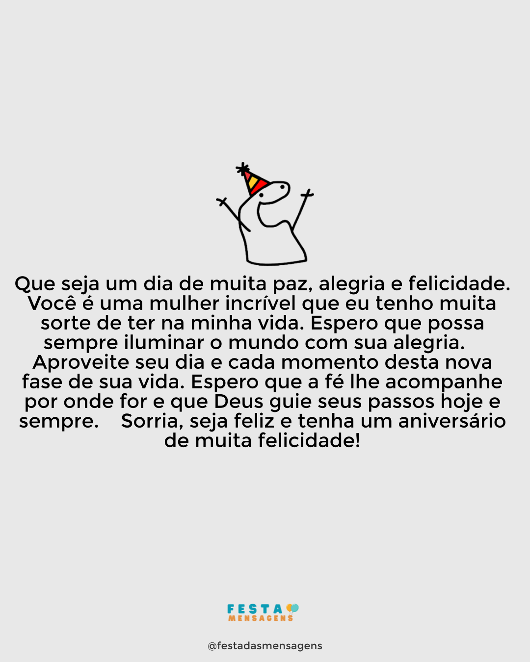 Querida amiga, a vida é um presente do Pai e cada aniversário é um novo começo. Desejo que venha de Deus a mais completa renovação, que ela flua interiormente e contagie a todos que tenham o privilégio de estar ao seu redor. Faça com que cada dia seja encarado com esperança de modo que as sombras do ontem não sejam levadas para a luz do amanhã. Um olhar amigo alegra o coração, uma boa notícia nos faz sentir bem. Que a luz do Pai ilumine sua vida, guie seus passos e alegre seu caminho em toda sua existência. Não só hoje, mas sempre. Feliz aniversário, minha amiga, seja imensamente feliz!
