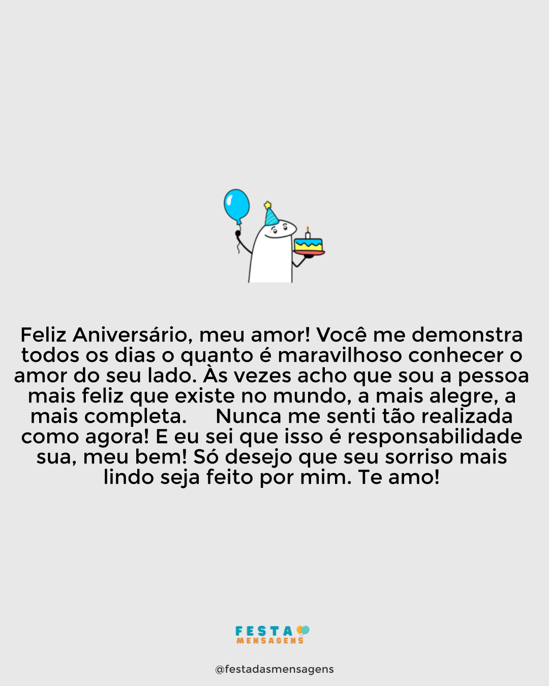 Feliz aniversário, meu companheiro de vida! Que este novo ciclo seja marcado por momentos inesquecíveis e conquistas compartilhadas. Espero que cada dia seja uma oportunidade para fortalecermos ainda mais nossa união e para demonstrarmos quanto somos felizes juntos. Amo e sempre irei amar você...
