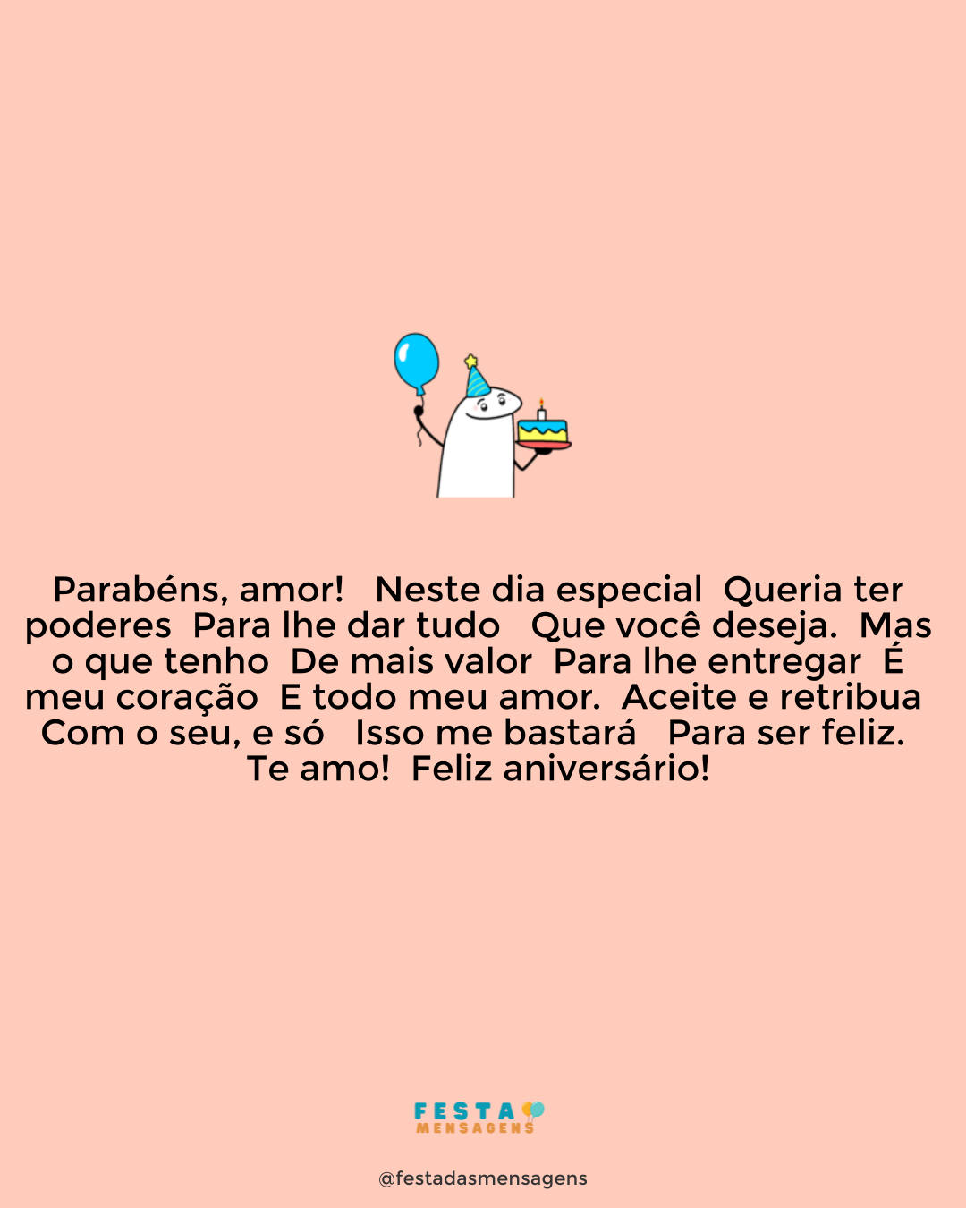 Você surgiu na minha vida quando nada fazia sentido, pintando o quadro da minha vida com cores que nunca tinha visto. Você despertou na minha alma sentimentos que eu pensava que só existiam nas telas de cinema. Todos os dias eu acordo com uma vontade enorme de te fazer feliz, e vou dormir pensando em você. Ficar do teu lado não é apenas um desejo: é uma necessidade. Minha inspiração, meu sol, a razão de tudo o que belo no meu coração. Você é tudo o que eu preciso para aguentar as batalhas da vida. Do teu lado eu sei que posso vencer, porque você me ajudou a conquistar os meus maiores medos. Que você continue sendo essa pessoa maravilhosa, que cativa todo mundo e que conquistou o meu amor eterno. Saiba que aconteça o que acontecer, o meu amor por você continuará crescendo a cada dia! Eu te amo! Feliz Aniversário!