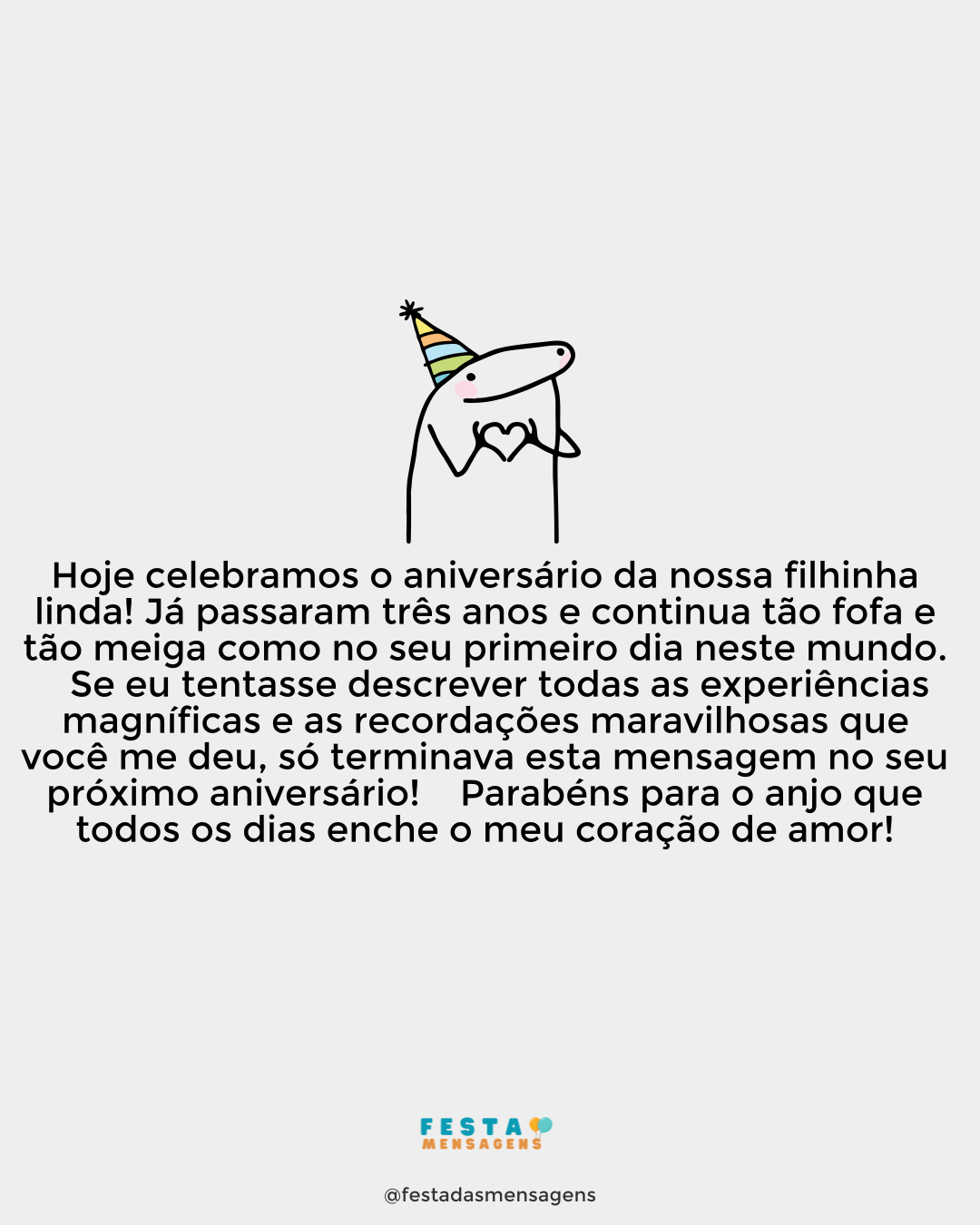 Filhinha amada, hoje o dia é todo seu e eu espero que possa aproveitar intensamente. Você está completando 13 anos e espero que possa viver toda a alegria que esta idade tem para oferecer. Que seu novo ano seja cheio de emoções, de alegrias, de risadas. Que possa descobrir novas paixões, viver novas aventuras. Eu criei você para ser uma menina livre e espontânea, para que possa aproveitar todos os dias. Desejo uma felicidade infinita e uma alegria interminável para seu novo ano que começa agora. Feliz aniversário, filha querida!