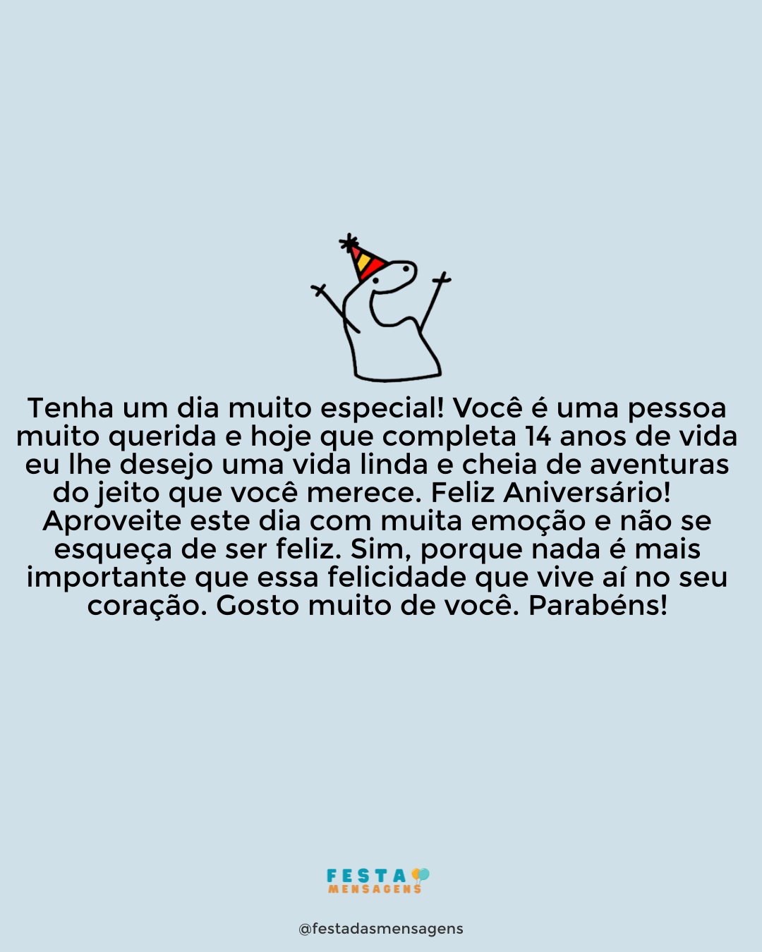 Tia, este dia é seu e você pode fazer tudo aquilo que desejar, porque merece, porque é justo. Por tudo que lutou e pelas vitórias que alcançou no último ano, parabéns! Eu adoro você! Espero que seu aniversário seja um dos mais marcantes de sempre, que não lhe falte alegria nem vontade de viver mais e mais a cada novo dia. Você é uma guerreira que jamais será vencida! Além de tudo, titia, você é também uma inspiração, talvez a maior de todas na minha vida. Pensar em você e nas batalhas superadas é encontrar paz e ganhar esperança para as lutas do dia a dia. Agora divirta-se! Divirta-se muito, tia! Mil beijos de aniversário!