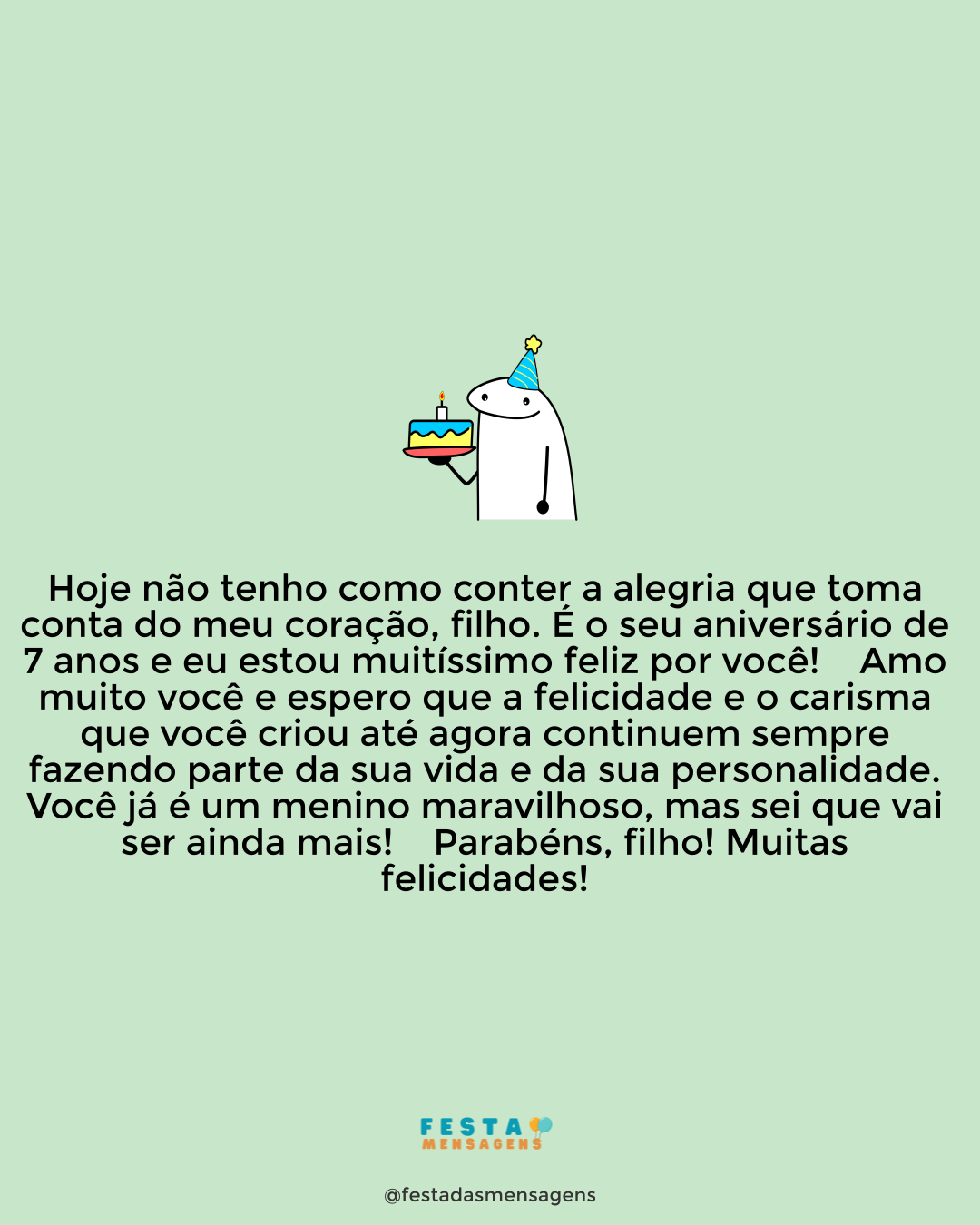 Que hoje tudo lhe soe bem ao ouvido e nada fique por dizer da sua boca. Filho, divirta-se, encontre a paz que precisa e sinta-se orgulhoso do que construiu ao longo de doze anos maravilhosos. Feliz aniversário! Tenho uma admiração muito grande por você e não só por ser meu filho, mas também por ser o menino doce que sempre foi. É muito gratificante enxergar seu sorriso no seu rosto bom e delicado. Se eu pudesse faria tudo para que esse brilho que exala da sua pele nunca desvanecesse. Meu príncipe, pense só em coisas belas e sorria muito, dê risadas sem parar, não só hoje, mas também amanhã. Parabéns por completar sua primeira dúzia de anos de vida.
