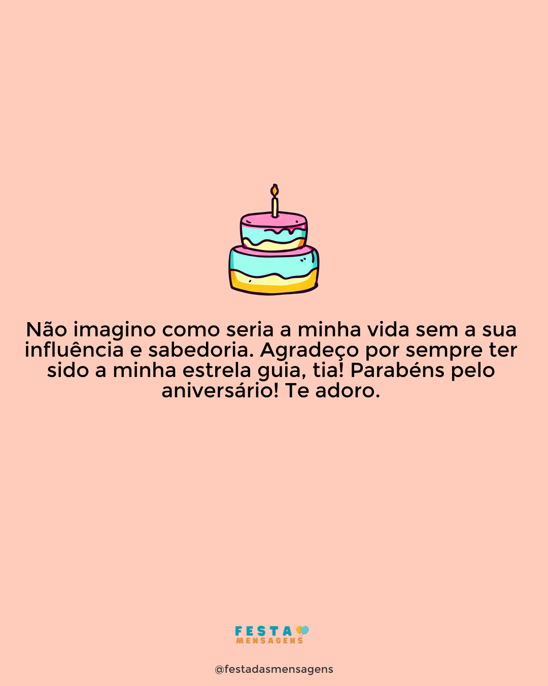 Parabéns, madrinha! Hoje o dia é tão especial que nem consigo imaginar como vai terminar, mas certamente será em festividade. Tenho certeza que vai haver muita alegria e emoção positiva, muita risada e celebração. Você é minha segunda mãe e isso é algo que não tem preço. Só espero retribuir com meu amor em todos os instantes da minha vida. Tenha um dia maravilhoso, querida madrinha! Beijo.