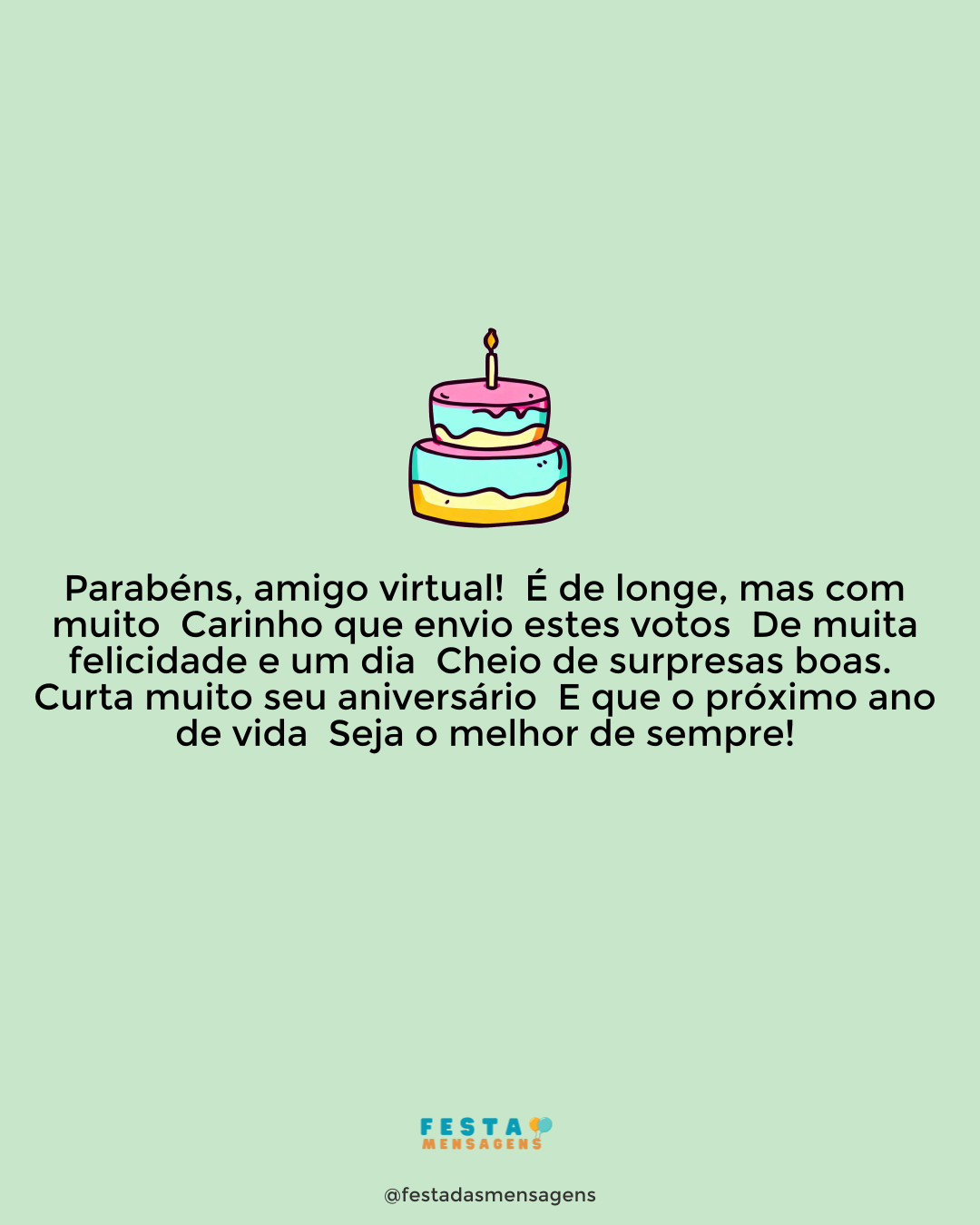 Mais um ano que se vai e desta vez a festa vai ser diferente porque não vou poder estar com você. Infelizmente você está longe e vou ter que me contentar em trocar um abraço apertado por pensamentos positivos. Mas de uma coisa você pode ter certeza, vou torcer muito para que o seu dia seja incrível e que o seu ano seja ainda melhor! Um feliz aniversário e que seja um ano de muitas vitórias! Parabéns!