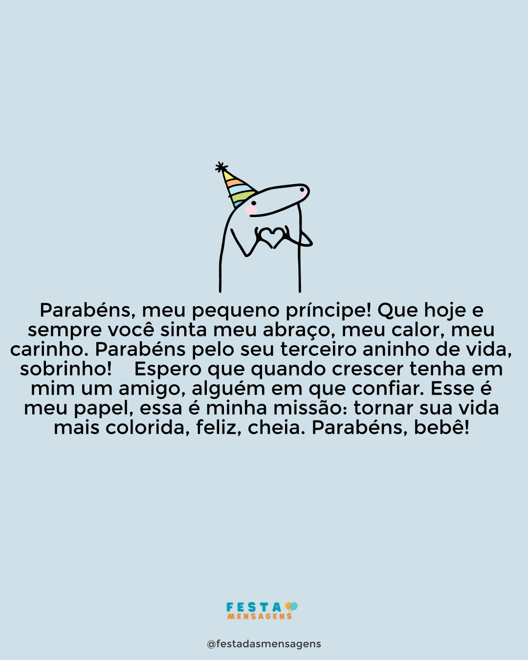 Oh, meu sobrinho querido, já passaram quatro anos e você continua o mesmo menino esperto de olhar cativante e sempre pronto para uma risada monumental. Hoje você está de parabéns. Quatro anos de vida! Feliz aniversário! Quero muito ver você sorrir, correr, pular de alegria, cantar sem filtro para volume! Preciso de enxergar felicidade no seu rosto, sentir a fome de viver a pulsar na sua pele. Você, meu querido, é mais do que um sobrinho para mim: é um quase filho! Divirta-se muito e não só hoje, mas sim durante toda sua vida. Brinque todos os dias como se o próximo nem sequer estivesse no calendário. Seja feliz, muito feliz, e lembre-se que perto ou longe eu estarei sempre ao seu lado. Parabéns, menino!