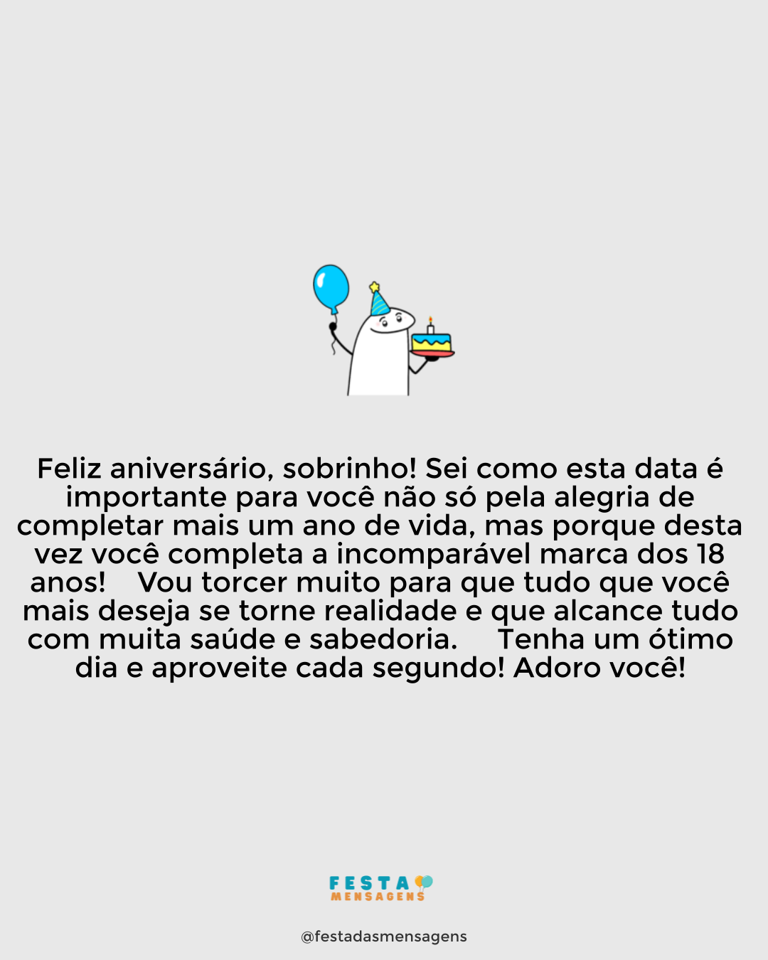 Parabéns, minha querida sobrinha! Ainda me lembro quando pegava você no colo, quando você era ainda uma criança. E hoje você está completando dezoito anos. É já uma mulher! Como é possível que o tempo tenha passado tão rápido. Mas eu fico feliz por verificar que seu crescimento foi sustentado em valores e princípios maravilhosos. Desejo que seu dia seja maravilhoso e que a felicidade esteja sempre perseguindo seus sonhos, minha querida! Beijo.