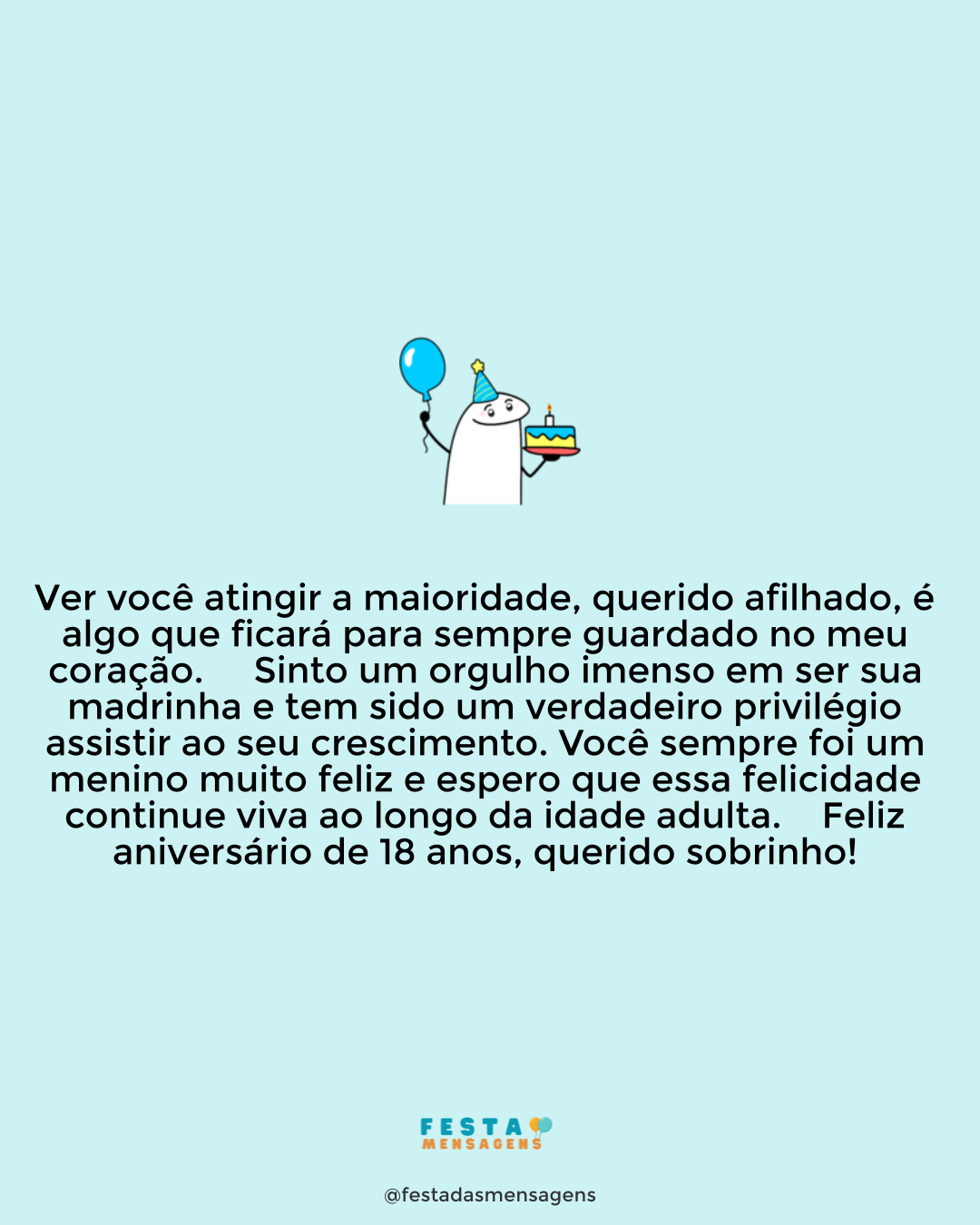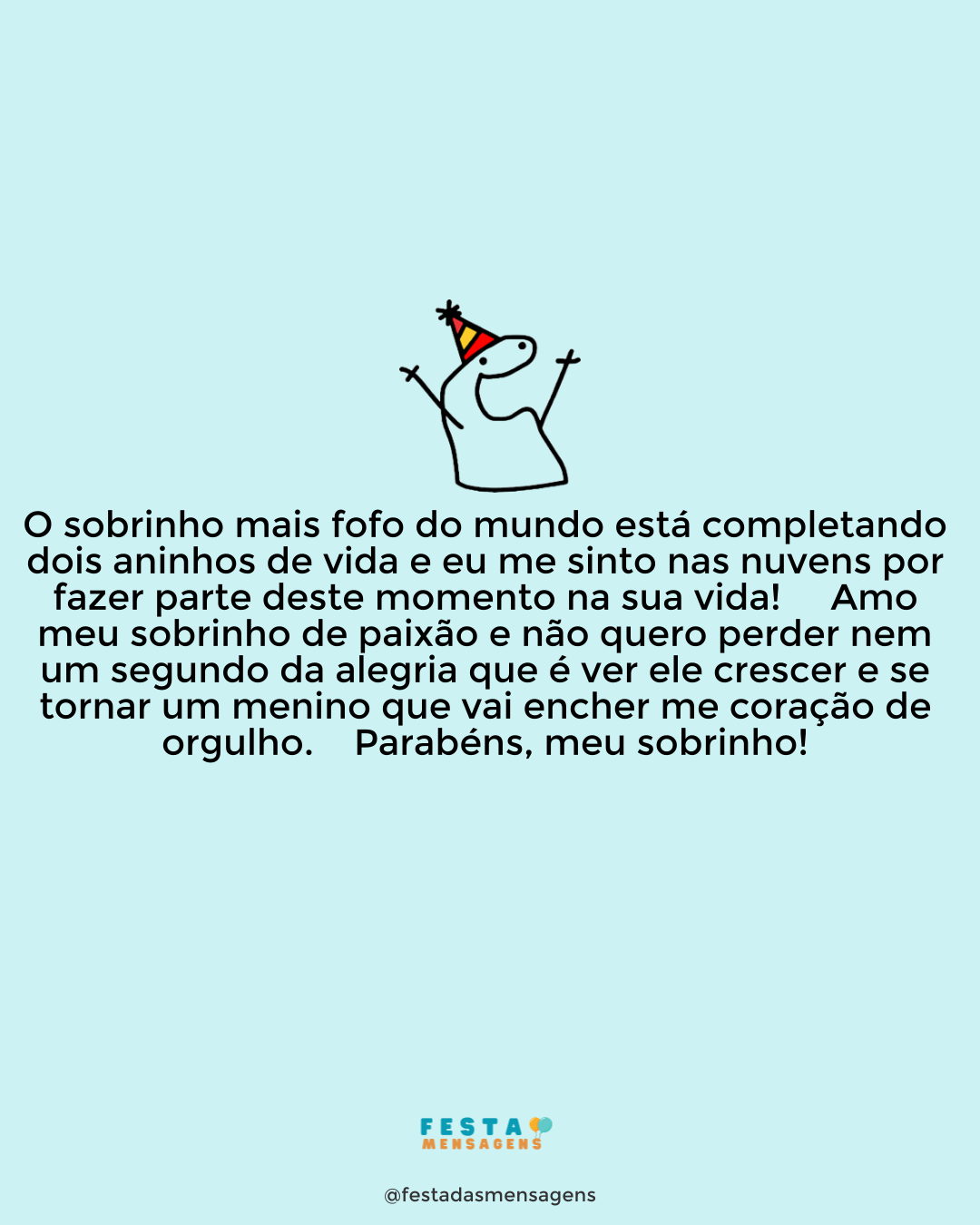 Neste dia tão especial, quero lhe desejar um ano de muitas risadas, conquistas e momentos felizes. Você é uma bênção na nossa família, sobrinho amado! Parabéns, divirta-se muito e aproveite seu dia com muita brincadeira!
