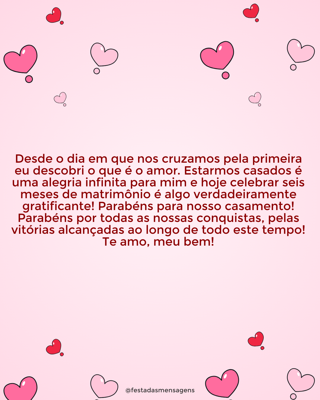 Meu amor, hoje completamos 9 meses de casados e da melhor festa que já fui na minha vida! Que sorte a minha ter encontrado você no meu caminho. Eu amo você mais que qualquer coisa! Hoje nós completamos nosso 9º mês de casados, nossas bodas de maternidade! E é assim mesmo que eu me sinto, cultivando nosso amor como se fosse um bebê que queremos proteger e ter junto todas as horas. Você é a minha paixão e quero passar cada segundo ao seu lado! Parabéns pelo nosso dia, meu amor!