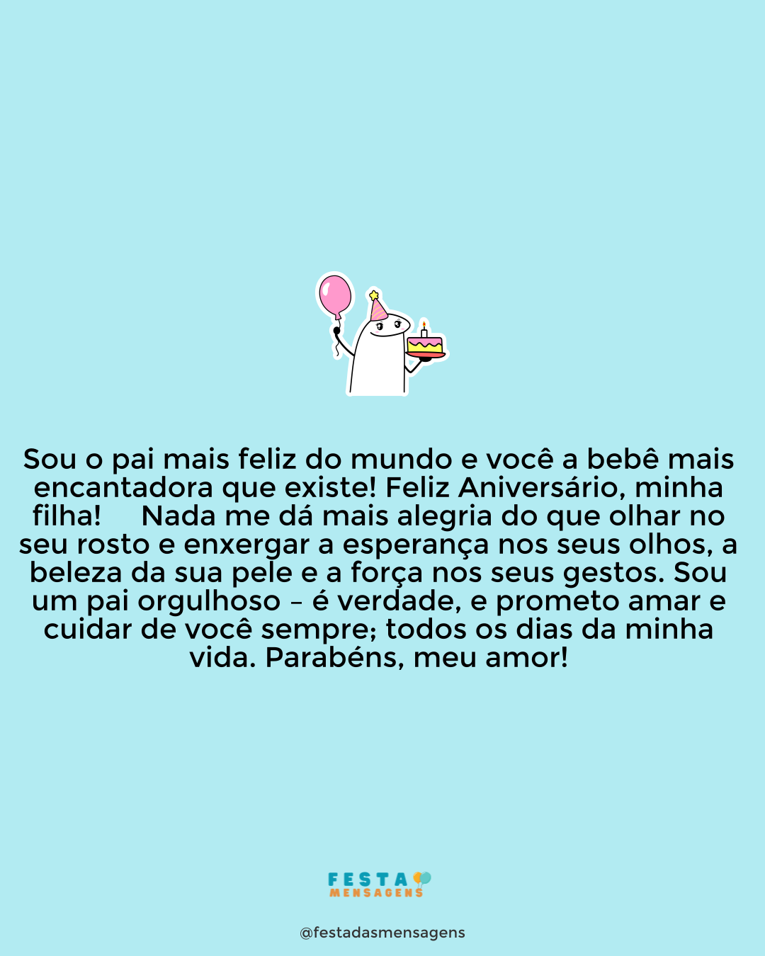Minha querida filha, eu estou muito, muito feliz, mas sinto que meu coração está também muito assustado por você estar crescendo a uma velocidade incrivelmente rápida. São já treze anos! Parabéns, querida! Espero que você se divirta muito ao lado das pessoas que mais ama, junto de quem sempre quis o melhor para você. Espero que goste do meu presente e, acima de tudo, que se sinta em paz, de bem com a vida. Feliz aniversário, princesa! Eu gosto muito de você.
