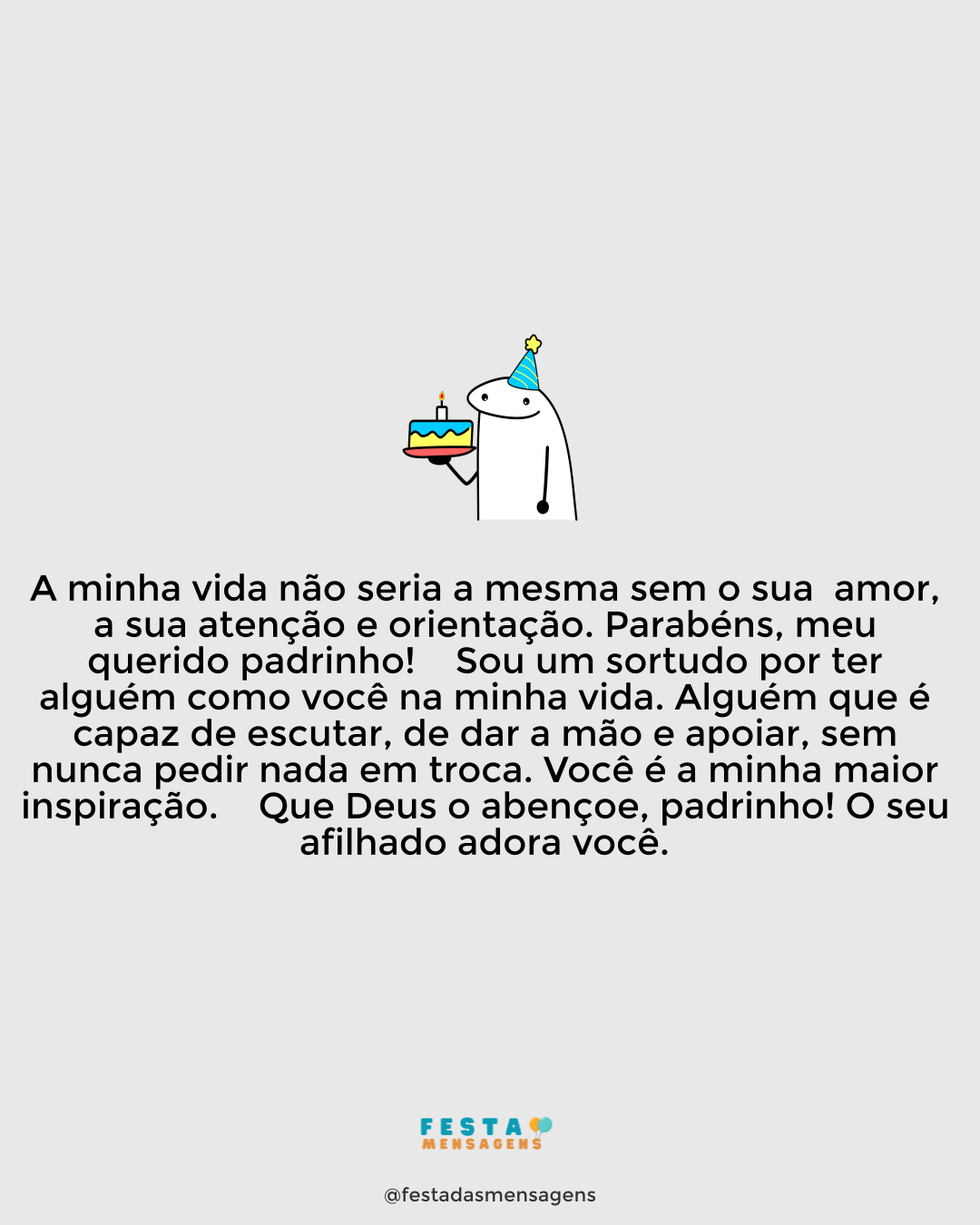 Neste dia muito especial, Deus está olhando para você e todos os anjos do Senhor estão soprando felicidade, amor, saúde e paz em sua direção. Hoje, abra o coração carinhosamente e receba toda bênção que Deus tem para você, saiba agradecer cada nova graça que lhe acontece, agradeça por cada novo dia que amanhece. Você é uma pessoa boa, generosa, e que sabe deixar-se guiar pela palavra e ensinamentos de Deus. Com fé nas palavras do Senhor, você sabe que tudo é possível, porque Deus ama você e é misericordioso. Com a mão de Deus para se apoiar, você é mais forte, você é capaz de tudo, e não tem razões para temer. Eu desejo que neste dia você receba muito amor e carinho dos seus amigos e familiares, e que tenha o seu fôlego renovado para mais um ano de vida que se inicia agora. Parabéns e que Deus te abençoe!