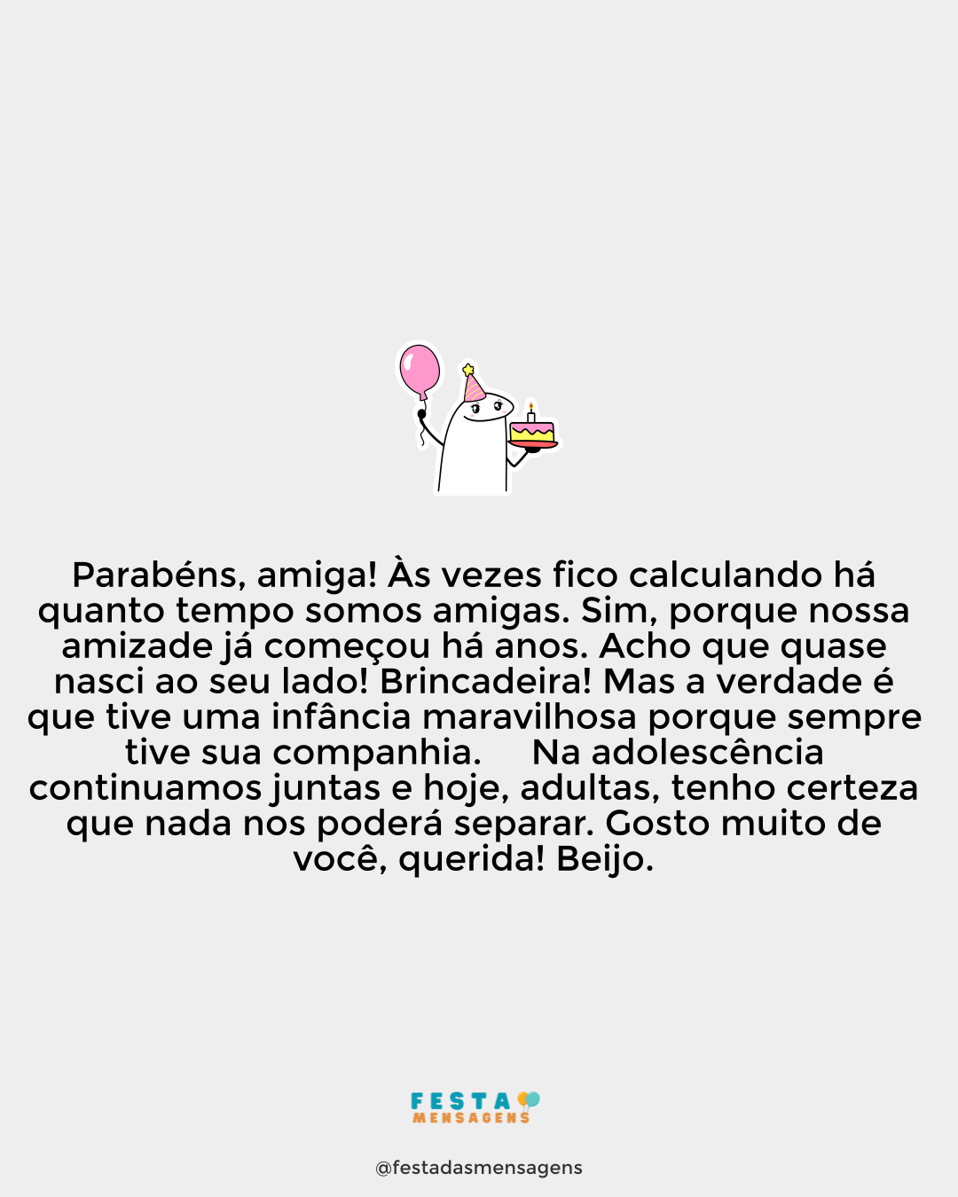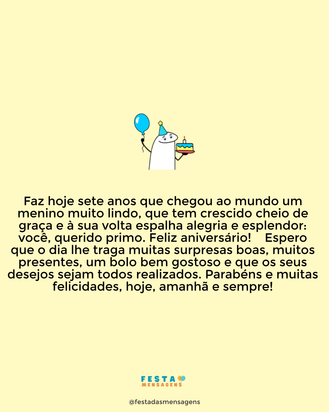Parabéns por completar 12 anos de vida! Acho que hoje você entra oficialmente na adolescência. Começam agora mesmo a surgir as primeiras e grandes dúvidas, as certezas, as ilusões, os amores e amizades para toda vida. Aproveite esta etapa com confiança e ambição de curtir todos os momentos; de fazer com que todos os instantes perpetuem na sua memória. Viver a sério é viver com intensidade, por isso viva de verdade. Reúna seus amigos e amigas, os familiares que mais gosta, as pessoas que mais ama. Faça uma grande festa, orgulhe-se do que já construiu e preserve com serenidade os sonhos que tem para realizar. Feliz aniversário!