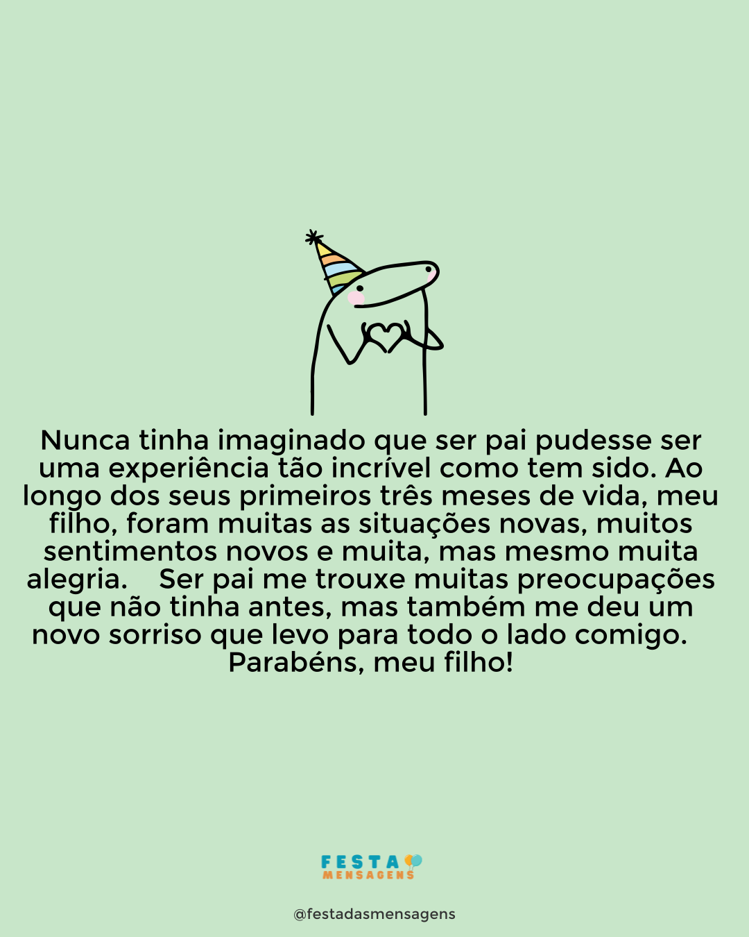 Parabéns, filhote! É com o coração a irradiar alegria, mas também com o pensamento recheado de nostalgia que celebro seu dia, meu filho. São 15 anos repletos de aventuras e muito amor, é claro. Passou tudo tão rápido! Às vezes fico me questionando se aproveitei todos os instantes do seu crescimento. É claro que muita coisa passou e eu não assisti, mas sei que estive sempre junto para apoiar e dar meu contributo. Você tem sido um filho maravilhoso ao longo de todos estes anos. E só posso sentir orgulho e muita admiração pelo menino e homem que você é. Mas agora chegou a hora de comemorar, por isso aproveite esta data em grande estilo. Feliz aniversário, filho!